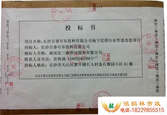 2013年10月18日,长沙百事可乐饮料有限公司,邀请我公司加入排水管道改建投标事宜。百事可乐公司在网上找到我公司,对比详细了解公司实力后,尤其是管道疏通清理这块,再看了公司的工程案例后,觉得宏三湘非常合适。此次公司高层管理人员非常重视,祝愿此次投标成功! (我公司工商现已经并更为 湖南鸿鹄林市政工程有限公司)