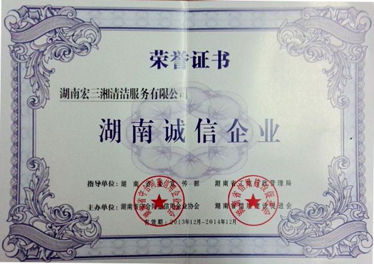 我司秉承诚信经营理念,展示出了企业诚信的力量,树力了诚信企业典范。经各行业协会推荐,和我司自荐,在活动组委和专业严格评审及声誉监测下,湖南宏三湘清洁服务有限公司,非常荣幸被评为“湖南诚信企业”。