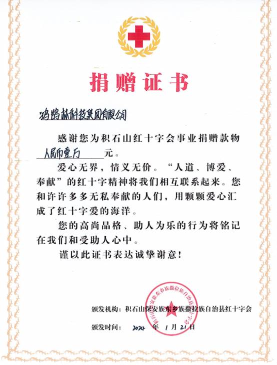 2024年1月:积石山地震捐款,红十字会颁发“捐赠证书”;